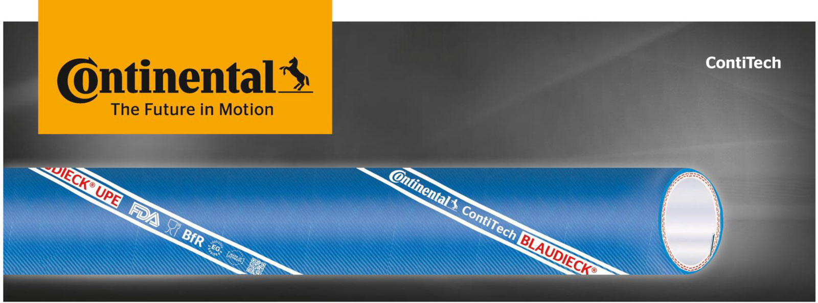 青いカバーに2本の白ストライプと「Continental ContiTech BLAUDIECK® UPE FDA グラス/フォークシンボル BfR EG 1935/2004 2023/2006ドイツ製」のロゴがスパイラル状に印刷されています。